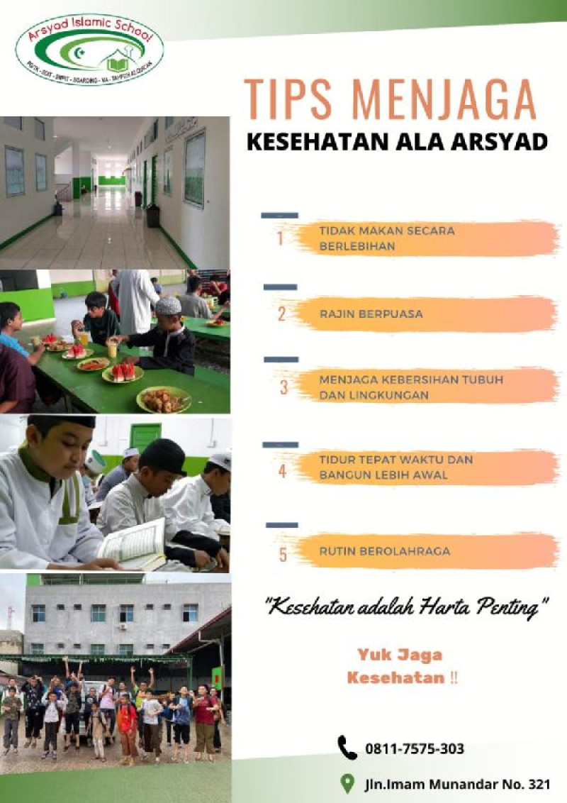Islam selalu mengajarkan pengikutnya kepada jalan yang baik dan benar. Begitu juga dalam hal menjaga kesehatan. Arsyad Islamic School menerapkan beberapa Tips dalam menjaga Kesehatan. Apa saja itu?? Yuuk kita simak Teks dibawah ini.