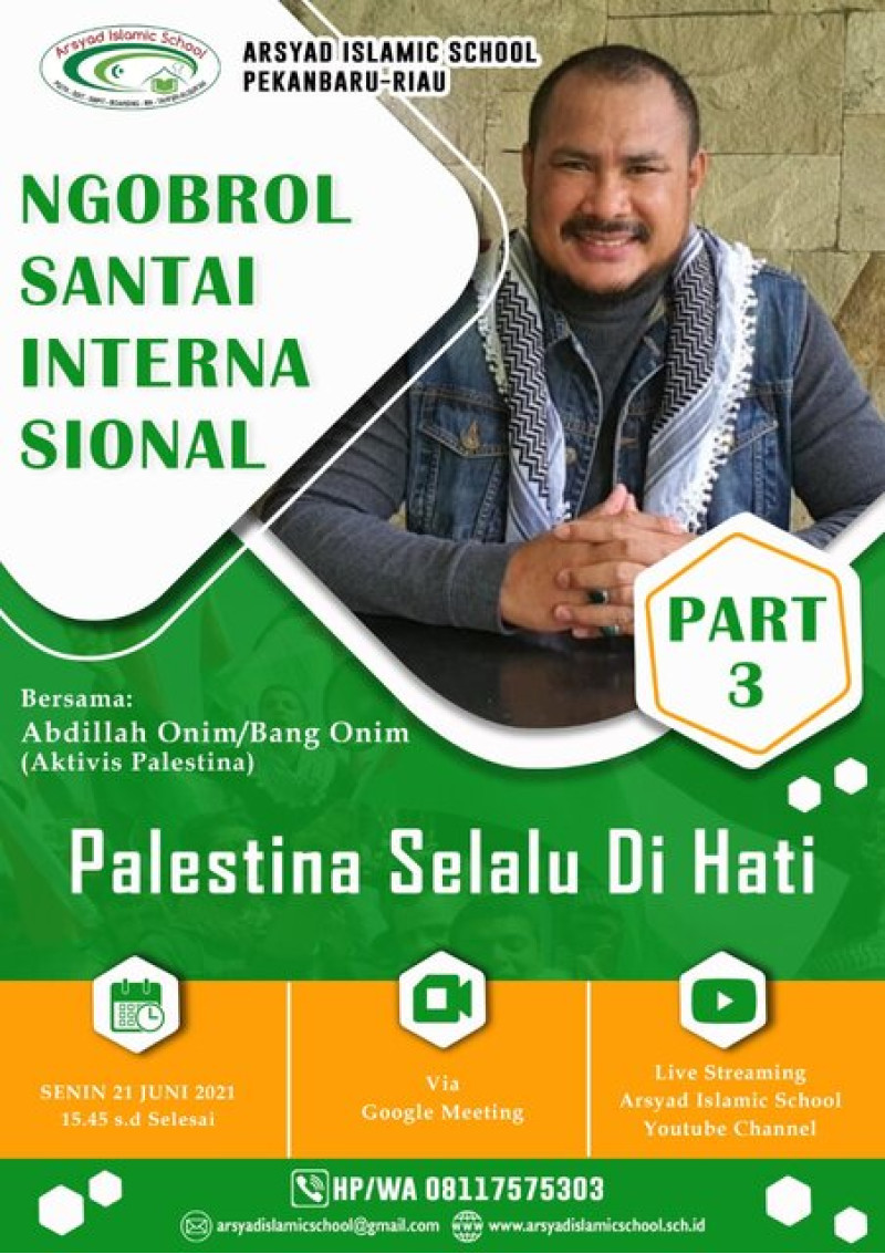 Karena memang banyak hal yang masih disembunyikan dan tidak diungkapkan dunia tentang Palestina. Hal ini menjadi alasan bagi Arsyad Islamic School Pekanbaru bersama Bang Onim seorang aktivis Palestina untuk berusaha menyuarakan keadilan dan kemanusiaan agar bisa terealisasikan di Negri Palestina melalui fakta yang disajikan langsung oleh Bang Onim dari Palestina. Arsyad Islamic School Pekanbaru bangga bisa menghadirkan Bang Onim dalam Ngobrol Santai Virtual kali ini, hal ini tentu menjadi wadah untuk menggerakkan kembali rasa empati dan persaudaraan kita pada saudara kita di Palestina. Bahwa Palestina ada dan akan selalu di hati.