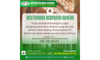 ARSYADISLAMICSCHOOL.Puasa Arafah salah satu Puasa sunnah yang sangat dianjurkan. Puasa Sunnah Arafah jatuh pada tanggal 09 Dzulhijjah, yaitu hari ketika jamaah haji sedang melaksanakan wukuf di arafah. Puasa ini sangat dianjurkan bagi mereka yang sedang tidak melaksanakan haji.Puasa Arafah memiliki...