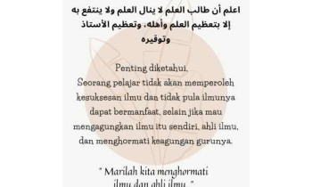 Mengagungkan ilmuاعلم أن طالب العلم لا ينال العلم ولا ينتفع به إلا بتعظيم العلم وأهله، وتعظيم الأستاذ وتوقيرهPenting diketahui, Seorang pelajar tidak akan memperoleh kesuksesan ilmu dan tidak pula ilmunya dapat bermanfaat, selain jika mau mengagungkan ilmu itu sendiri, ahli...