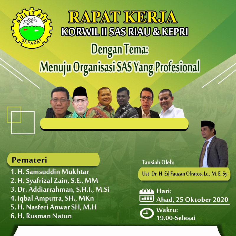 In Sya Allah pada hari ahad tepatnya pada tanggal 25 oktober 2020 akan dilaksanakannya kegiatan Rapat Kerja Korwil SAS yang dengan mengangkat Tema menuju organisasi SAS yang profesional. Pada kegiatan ini nanti nya akan diisi dengan Tausyiah oleh Ustadz Dr. H. Ed Fauzan Ofratos, Lc, M. E.Sy