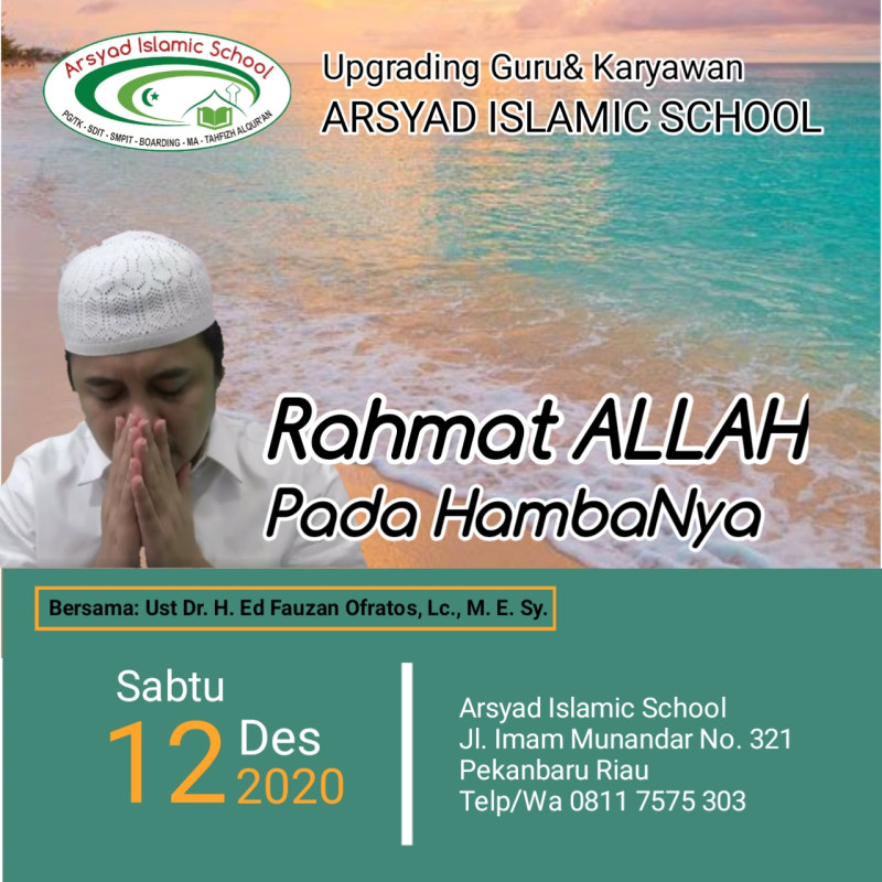 SABTU, 12 Desember 2020 In Sya Allah Rutinitas Guru Arsyad seperti Biasa di Hari Sabtu Upgrading, Mengupgrade diri menjadi lebih baik, Mencari Ilmu, yang akan di Isi Oleh Ketua Yayasan PDA Ibadurrahman Yakni Ust. DR. H. Ed Fauzan Ofratos, Lc,. M. E. Sy. Dengan Tema Rahmat Allah Pada Hambanya, Mari kita Ramaikan, In Sya Allah berkah dan bermanfaat. Raih Ilmu nya, dan Kejar Keberkahannya.