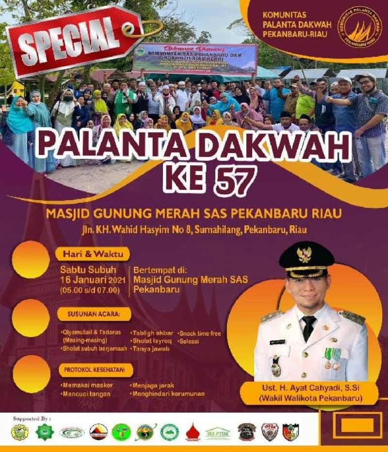 Sabtu, 16 Januari 2021 Bakda Subuh Di Masjid Gunung Merah SAS Pekanbaru, Ustadz Ayat Cahyadi akan memberikan tausiyah dalam Program Palanta Dakwah yang Ke 57.