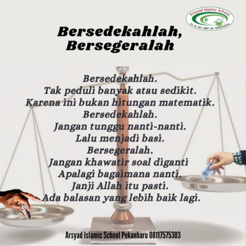 Jangan tunggu banyak, karena seringnya makanan yang disimpan justru basi dan terbuang. Sama halnya dengan harta, bersedekahlah meski sedikit. Jangan pikirkan soal ganti apa lagi bagimana nanti. Ingat Allah Maha Kaya, Dia tidak perlu harta hamba-Nya, tetapi Dia hanya sedang menguji hamba-Nya soal menjadi baik, bermanfaat dan ikhlas. Jika Allah sudah sayang, maka In syaa Allah tidak akan ada halangan yang merintang.