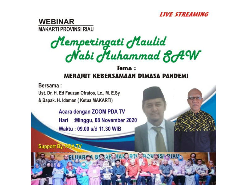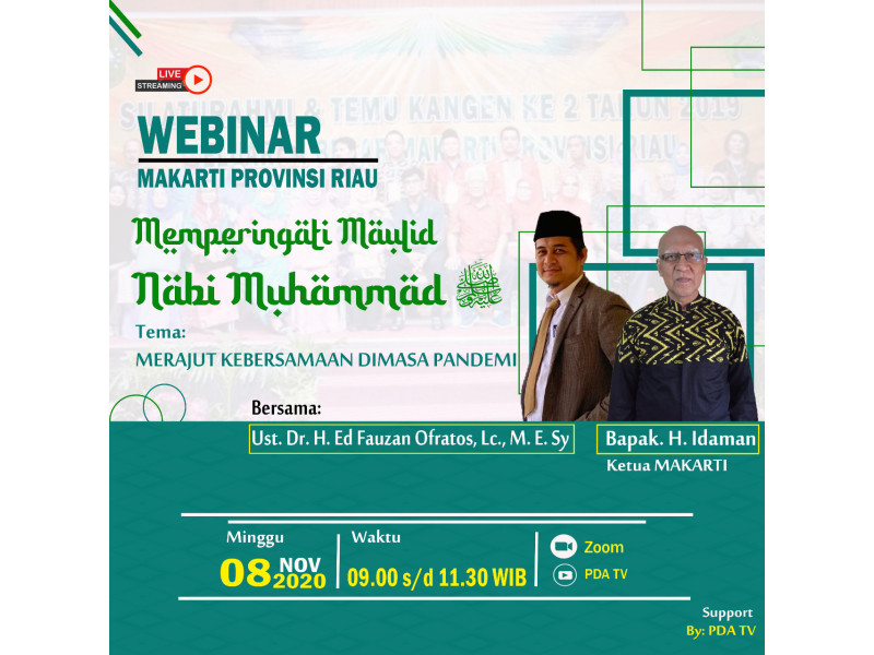 Minggu, 08 November 2020 Telah terlaksana Kegiatan Webinar Makarti Provinsi Riau dalam Rangka Memperingati Maulid Nabi Muhammad SAW. Webinar dengan mengangkat Tema Merajut Kebersamaan di Masa Pandemi.Webinar ini di isi Tausyiah oleh Ust. Dr. H. Ed Fauzan Ofratos, Lc, M.E.Sy...